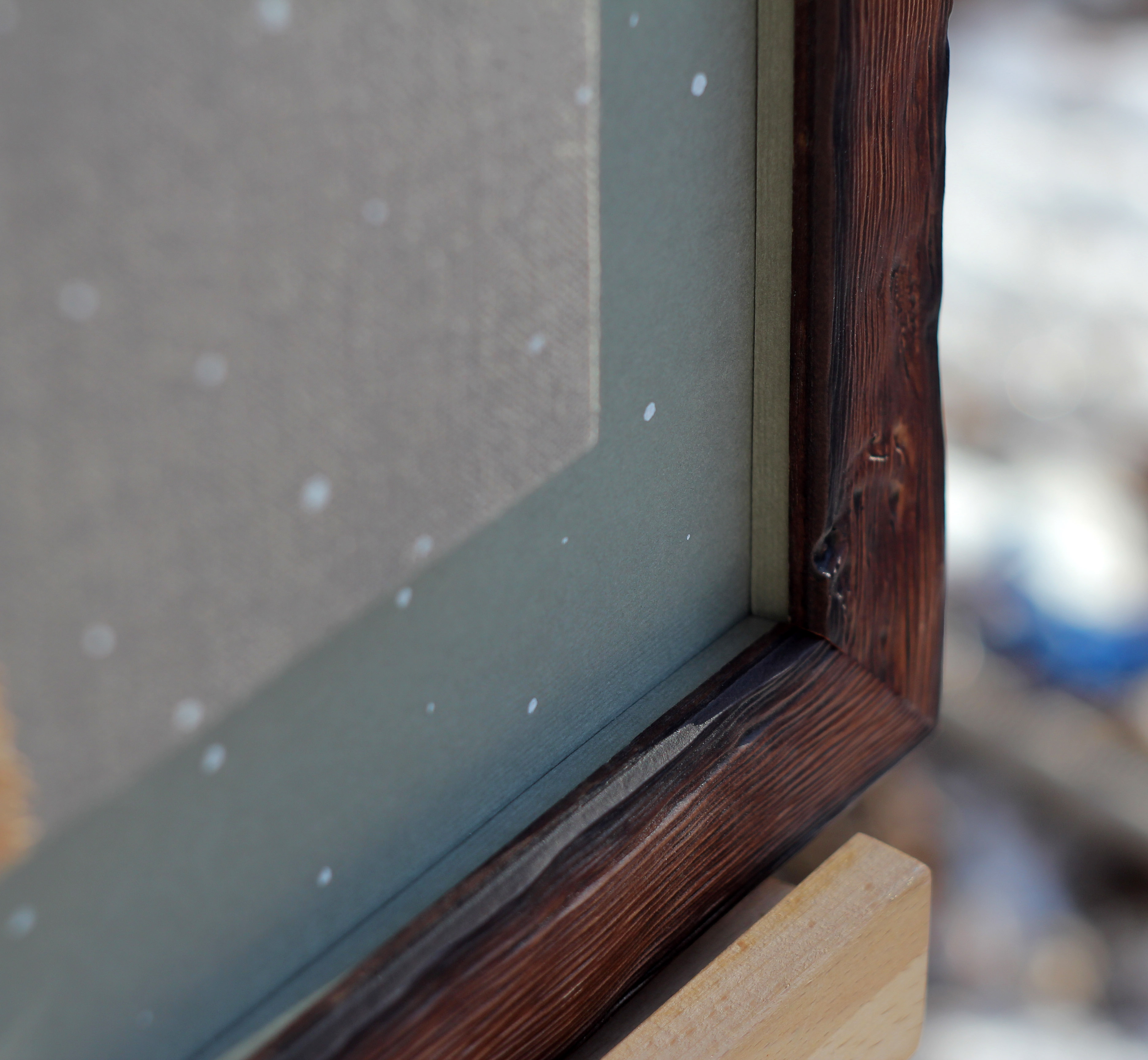 - Дорисовка по паспарту: Художник аккуратно продолжает сюжет вышивки, создавая иллюзию, что изображение выходит за границы канвы.